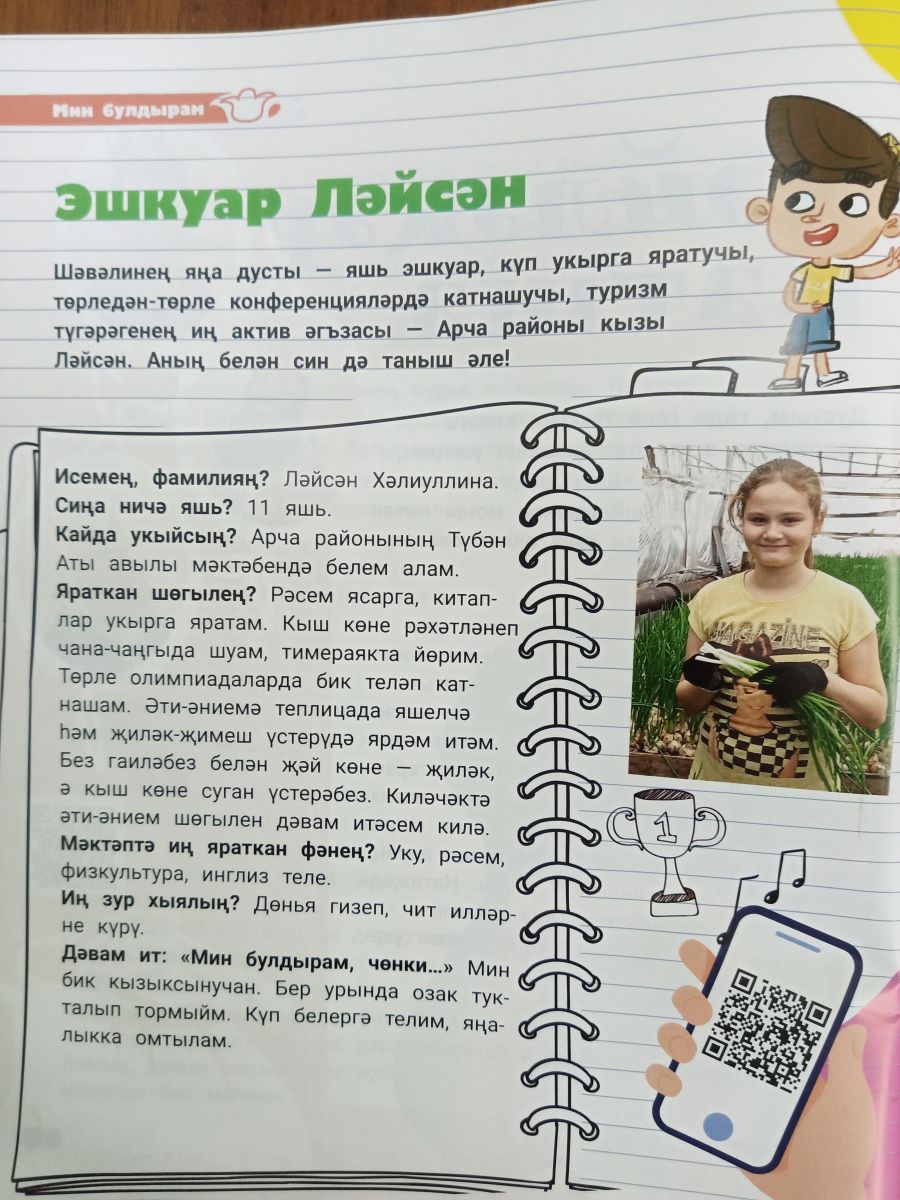 Бүген “Сабантуй” журналының яңа санын кулга алдык.Бу сан безнең өчен аеруча кадерле булып чыкты: үзебезнең укучылар турында укып шатландык.”Мин булдырам” проектында катнашучы IV сыйныф укучысы Хәлиуллина Ләйсән турындагы язманы кулдан кулга йөртеп укыдык.