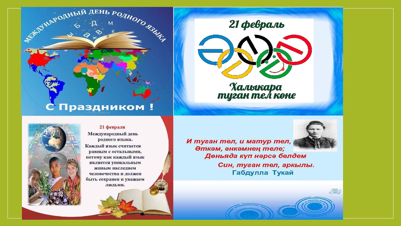 21 февраль — Халыкара туган тел көне буларак билгеләп үтелә. Халкыбызның гореф-гадәтләрен, тарихын, мәдәниятын мең еллар буенча саклап килүче байлык ул - тел. Менә нинди көчкә ия безнең туган телебез! Телсез – халык үзе дә була алмый, халыксыз – тел дә юк. Шуңа күрә, телгә мәхәббәт ул- бер үк вакытта туган халкың, туган илеңә дә мәхәббәт дигән сүз.