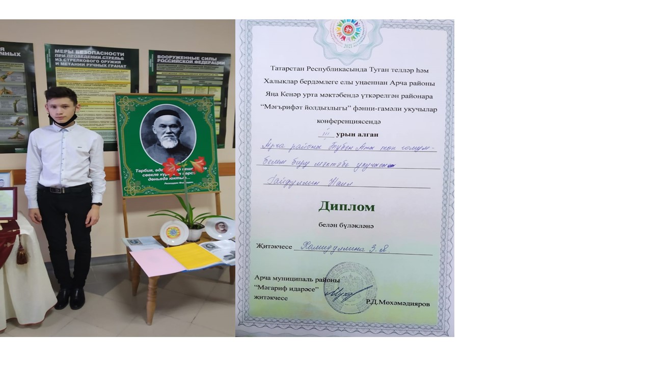 Татарстан Республикасында Туган телләр һәм Халыклар бердәмлеге елы уңаеннан Арча районы Яңа Кенәр урта мәктәбендә үткәрелүче районара “Мәгърифәт йолдызлыгы” фәнни -гамәли укучылар конференциясендә мәктәбебезнең 8 нче сыйныф укучысы Гайфуллин Наил дә катнашты. Ул “Сез иң гүзәл кеше икәнсез” дип исемләнгән юнәлештә башкарган иҗади эше белән чыгыш ясады: ветеран укытучыбыз Хәлиуллина Ләлә апаның тормыш юлы һәм педагогик эшчәнлеге турында сөйләде.Хөрмәтле остазыбыз Ләлә апаның хезмәт юлын чагылдырган эше өчен Арча районы мәгариф бүлегенең III дәрәҗә дипломы һәм Рәхмәт хаты белән бүләкләнде.