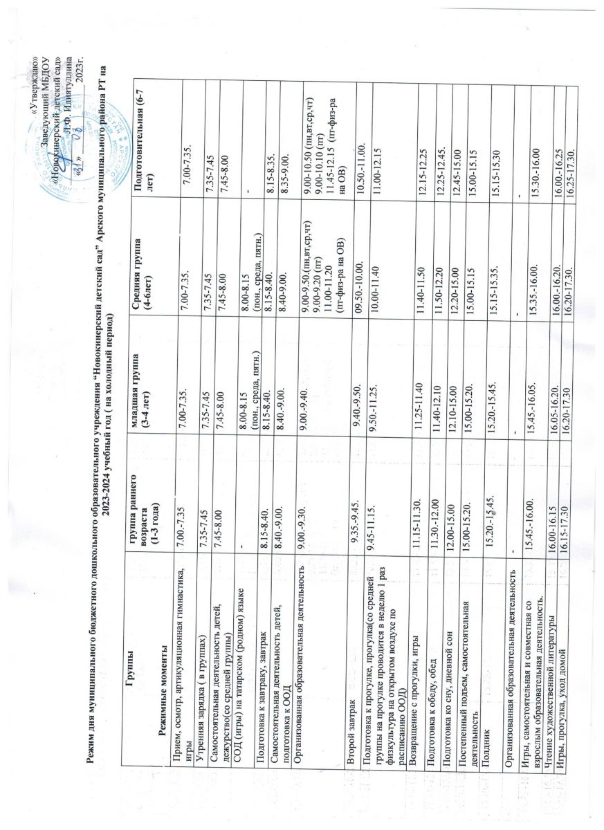 Режим работы детского сада: 5-ти дневная рабочая неделя; длительность работы детского сада – 10,5 часов: с 7.00 до 17.30 часов ежедневно, кроме праздничных и выходных - субботы, воскресенья. Основной структурной единицей детского сада является группа детей дошкольного возраста. В группах общеразвивающей направленности предельная наполняемость устанавливается в зависимости от возраста детей и с потребностью мест.