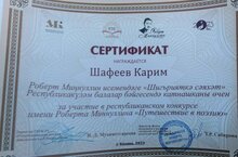 Шафеев Карим Роберт Миңнуллин исемендәге "Шигърияткә сәяхәт" Республикакүләм балалар бәйгесенең Арча районы этабын үтеп республика этабында катнашты. Катнашкан өчен сертификат белән бүләкләнде.Аны чын күңелдән котлыйбыз.