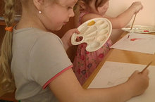 ИЗО деятельность.Конспект открытого занятия в подготовительной группе «За живой водой» . Цель: формировать у детей представление о художественном образе, знакомить с таинством рождения образа через эффект соучастия в творческом процессе его художественного создания. Побуждать детей устанавливать сходство между разными геометрическими формами и предметами и путем дорисовки получать цельное изображение героев любимых сказок, используя разнообразие цветовых оттенков. Предварительная работа: чтение сказок, рассматривание в них иллюстраций, смешивание красок для получения всех оттенков, закрепление названия геометрических форм в играх «Чего не хватает», «Сложи сам», «Собери по цвету». Материал к занятию: волшебная палочка, магнитофонная запись, 2 картины: Р. Г. Уутмаа «Ночное море» и Н. М. Ромадина «Розовая вода», 2 скамейки, листы с геометрическими цветными формами, простые карандаши, гуашь, 12 банок для воды, по 2 кисточки (тонкая и толстая) на каждого ребенка, палитра на каждого, 12 тряпочек, 6 подставок. 10.03.2016