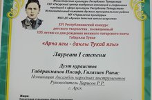“Арча ягы – данлы Тукай ягы” 31.03.2021 Арча балалар сәнгать мәктәбендә Габдулла Тукайның 135 еллыгына багышланган “Арча ягы – данлы Тукай ягы” XVI республика балалар иҗаты конкурс-фестивале үткәрелде. Безнең мәктәп укучылары да конкурста зур уңышларга иреште. “Халык уен кораллары.(Курай)” номинациясендә кече яшьтәгеләр арасында 2 класс укучылары Харисов Алмаз һәм Шәйхетдинов Кәрим 2 дәрәҗә Лауреат, урта яшьтәгеләр арасында 5 класс укучылары Ранис Гыйләҗиев 1 дәрәҗә Лауреат, Инсаф Габдрахманов 2 дәрәҗә Лауреат булдылар. Курайчылар дуэты (Ранис Гыйләҗиев, Инсаф Габдрахманов) 1 дәрәҗә Лауреат булды. Җиңүчеләрне һәм укытучылары Харисов Р.Р.ны котлыйбыз! Киләчәктә дә уңышларына сөенергә язсын!