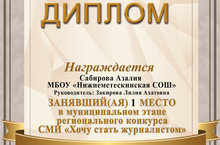 "Журналист булырга телим" конкурсының муниципаль этабында "Мин корреспондент" номинациясендә җиңүче булган 10 класс укучысы Сабирова А. котлыйбыз. Алдагы ярышларда уңыш телибез!