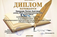 Котлыйбыз! 18.11.2020 "Медиатолерантность"-фәнни-гамәли мәкаләләр регионара конкурсның муниципаль этабында җиңүче булган тарих укытучысы Закирова Л.Ә.не котлыйбыз!