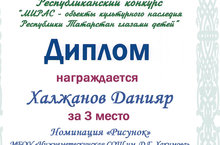 Республика күләмендә үткәрелгән “Мирас – Татарстан Республикасы мәдәни мирасы балалар күзлегеннән” конкурсында 5 класс укучысы Халжанов Даниярның ТАССРның 100 еллыгына багышлап ясаган рәсеме III урынга лаек булды. Даниярны, җитәкчесе Закирова Л.Ә. котлыйбыз!