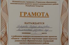 Поздравляем нашу коллегу-воспитателя Гафурову Р.А. с победой в конкурсе исследовательских проектов "Педагог-профессия творческая" среди педагогов дошкольных образовательных учреждений Арского муниципального района РТ.