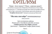 "Китап -белем чишмәсе"республика конкурсында Татарстан Республикасы белем бирү оешмаларының 5-7 сыйныяф укучылары һәм педагогик белем бирү оешмалары студентлары арасында үткәрелгән"Әлифбага багышлыйм" авторлык шигырьләр бәйгесендә 3 нче сыйныф укучысы Габдрахманова Зилә җиңү яулады һәм диплом белән бүләкләнде.(Укытучысы-Рәфыйкова Гөлфия Дәминовна). Алга таба да уңышлар Сезгә!!!