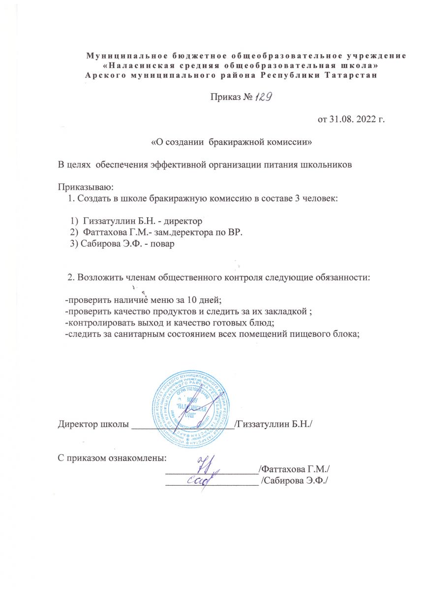 Приказ о создании бракиражной комиссии