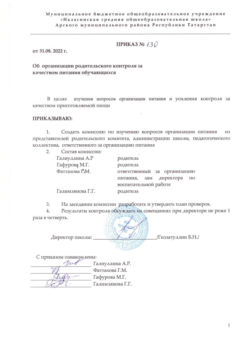 Приказ об организации родительского контроля за качеством питания обучающихся