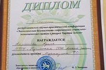 Участница 7 класса Ахметова А. участвовала и заняла 3 место в республиканском научно-практической конференции по теме: "Экологическая безопасность современных социально-экономических систем в ракурсе Хартии Земли" . Поздравляем!