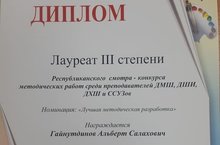 Поздравляем преподавателя отделения народных инструментов Гайнутдинова Альберта Салаховича, с дипломом лауреата III степени в номинации " Лучшая методическая разработка" в Республиканском смотре-конкурсе методических работ среди преподавателей ДМШ, ДШИ, ДХШ и ССУЗов.