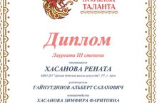Ученица Арской детской школы искусств Хасанова Рената (преподаватель Альберт Гайнутдинов, концертмейстер Зимфира Хасанова) в номинации инструментальный жанр - курай завоевала звание лауреата III степени.