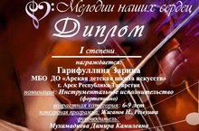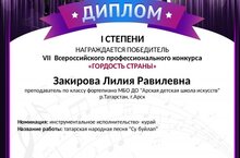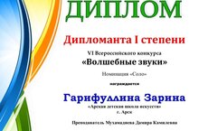 Балалар сәнгать мәктәбенең фортепиано бүлеге укучысы Гарифуллина Зәринәне "Тылсымлы тавышлар" Бөтенроссия конкурсының I дәрәҗәдәге дипломант дипломы белән котлыйбыз. Укытучы Мөхәммәдиева Дамира Камил кызы Рәхмәт хаты белән бүләкләнде.