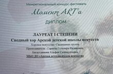 Арча балалар сәнгать мәктәбенең җыелма хоры Казанда узган Момент ART'a" Регионара бәйге-фестивалендә катнашып I дәрәҗә лауреат дипломына лаек булды. Җитәкчеләре Гәрәева Г.Р., Баһаветдинова А.С.