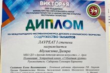 Арча балалар сәнгать мәктәбенең фортепиано классы укучысы Закирова Динә (укыт. Асанова В.М.) "Дарование" бәйге-фестивалендә уңышлы чыгыш ясап I дәрәҗә лауреат исеменә лаек булды. Котлыйбыз. -
