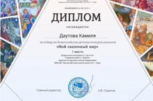 Рәсем+инглиз теле бүлеге укучысы - Даутова Камилә "Минем сихри дөнья" Бөтенроссия балалар рәсем бәйгеседә катнашып лаеклы урынга ия булды. Җитәкчесе Котдусова Г.Ф. Котлыйбыз! -