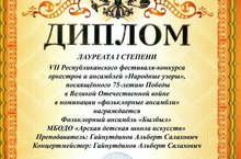 Поздравляем фольклорный ансамбль "Былбыл"(руководитель Гайнутдинов А.С. детской школы искусств, ставший лауреатом I степени VII Республиканского фестиваля-конкурса оркестров и ансамблей "Народные узоры" (заочно), посвященного 75-летию Победы в Великой Отечественной войне в номинации "фольклорные ансамбли".