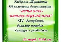 26 марта в Арской детской школе искусств прошел XIV Республиканский конкурс - фестиваль «Арча ягы - данлы Тукай ягы», посвященный 133 летию со дня рождения великого татарского поэта Габдуллы Тукая. В конкурсе - фестивале “ Арча ягы - данлы Тукай ягы” приняли участие 267 учащихся ДМШ, ДШИ Республики Татарстан, из 15 районов.