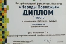 В г.Казани прошёл Республиканский конкурс "Народы Поволжья". Наш колледж был награждён дипломом 1 степени в номинации "Бабушкин сундук" (Плетение из ивы).