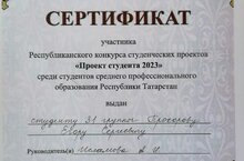 Студент 3 курса Прохоров Егор стал обладателем сертификата участника Республиканского конкурса студенческих проектов среди студентов СПО Республики Татарстан.