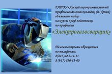 ГАПОУ «Арский агропромышленный профессиональный колледж» (п.Урняк) объявляет набор на курсы проф.подготовки по профессии «Электрогазосварщик».