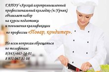 ГАПОУ «Арский агропромышленный профессиональный колледж» (п.Урняк) объявляет набор на курсы подготовки и повышения квалификации по профессии «Повар, кондитер».