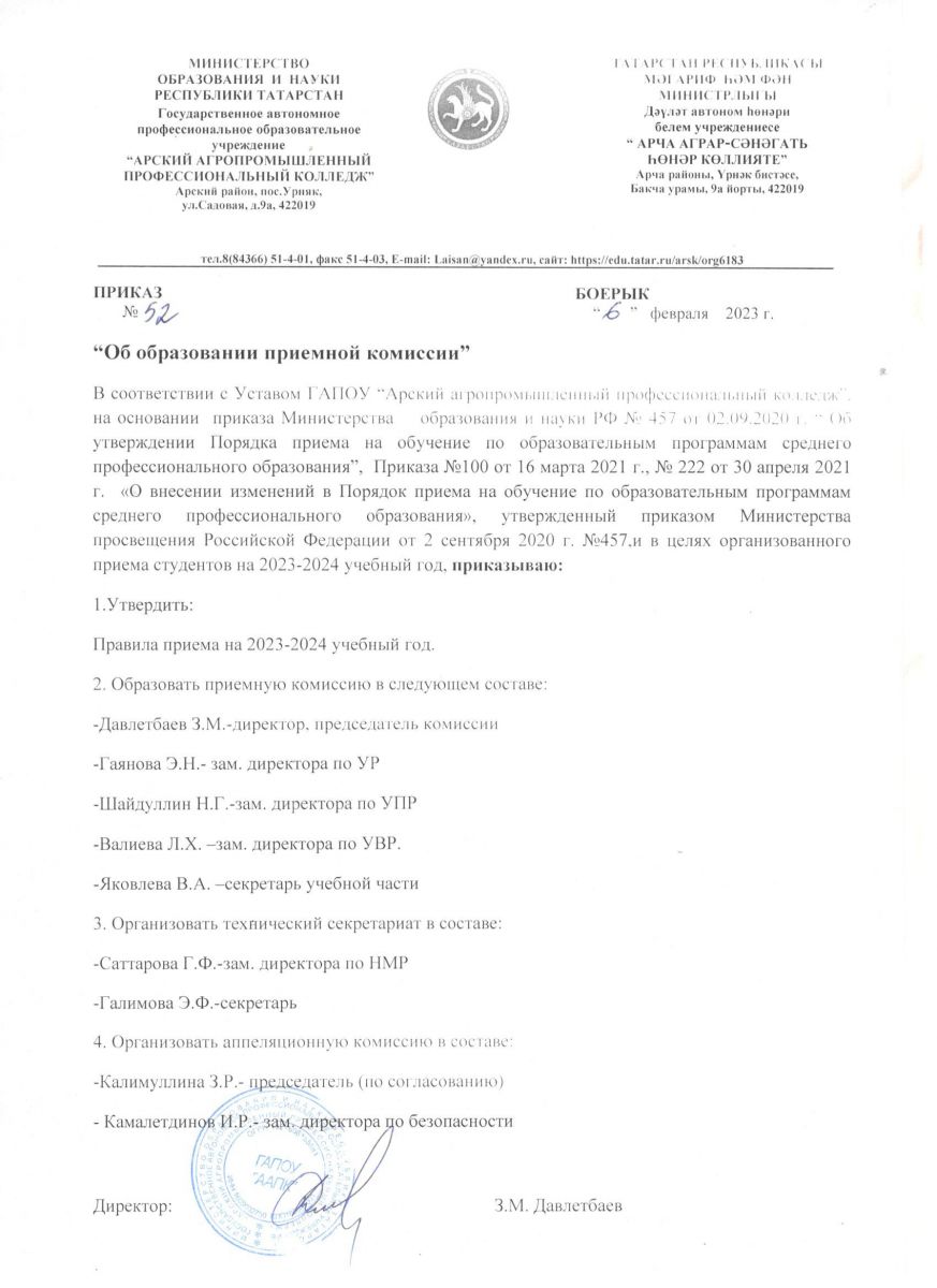 Приказ "Об образовании приемной комиссии" на 2023-2024 уч.год