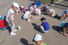 Асфальтта рәсем ясау - күңелле шөгыль, саф һавада йөрү, иҗат итү, баланың әйләнә-тирә дөньяны танып белүе. Балалар асфальтта акбур белән җәйнең иң матур мизгелләрен чагылдырдылар/Рисование на асфальте - это не только веселое занятие во время прогулки, а это еще творчество и познание малышом окружающего мира. В солнечный день лета дети рисовали мелом на асфальте.
