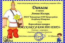 Яңа гына "Расскажу я Вам про папу!" дип исемләнгән Рәсәйкүләм конкурс нәтиҗәләре билгеле булды. "Идея" гражданнар һәм яшьләр инициативасы үзәге оештырган әлеге конкурста 425 мәктәптән 2000гә якын кеше катнашкан. Шигырь, хикәя, рәсем, фильмнар номинацияләрендә уздырылган әлеге бәйгедә безнең мәктәптән дә ике укучы үз яштәшләре арасында хикәя төркеменә эшләрен тәкъдим иткәннәр иде. Нәтиҗәләр куандырырлык, укучыларыбыз бәйгенең II дәрәҗә призёрлары! Җитәкчеләре дә рәхмәт хатлары белән бүләкләнделәр. Афәрин, котлыйбыз!..