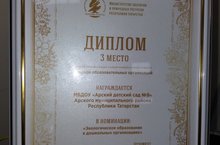 Воспитатели старшей группы №5 Э.И.Шакирова, С.Ф.Заббарова приняли участие в ежегодном республиканском конкурсе «Эколидер». По результатам представленной работы Министерство экологии и природных ресурсов РТ присудило МБДОУ «Арский детский сад №9» 3 место в номинации «Экологическое образование в дошкольных организациях». 8 декабря заведующая ДОУ Э.Г.Мустафина приняла участие в торжественной церемонии награждения победителей конкурса «Эколидер», которое состоялось в культурно-развлекательном комплексе «Пирамида» с участием Премьер - министра РТ И.Ш.Халикова и Министра экологии и природных ресурсов РТ Абдулганиева Ф.С. Представленный на конкурс материал свидетельствуют о том, что наше дошкольное учреждение успешно организует экологическое образование детей в образовательном учреждении.