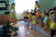 Дәрестә балалар “Кояш чык, болыт кач, без уйнарбыз җылыткач!”уенын уйнадылар, “гөрләвек” аша күпер салып чыктылар.Ә матур аланга килеп җиткәч, “зур-кечкенә” чыршыларны сайладылар, ак куян белән уйнап алдылар,геометрик фигураларга өйләрен табарга булыштылар, истәлеккә шигырь бүләк иттеләр