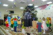 Наступил долгожданный Новый год. Ребята 11-ой группы с большим удовольствием слепили снеговиков, поиграли и отправились в лес за Дедом Морозом. Почему-то он не спешил в детский сад на праздник! На пути повстречали Бабу Ягу, она сделала вид, что никого не видела. Дети шли –шли, далеко зашли!... И вдруг из-за кустов выходит сам Дед Мороз!!! Только он был совсем на себя не похож – он был в шортах, в футболке и солнцезащитных очках!!! Что же случилось? Как случилось, что Дедушка попал в Африку? Это происки злой Бабы Яги, решили дети, ведь недаром она просилась на праздник! Только ловкость ребят в играх, исполнение новогодних песен, отгадывание сложных загадок, да и новогодний настрой помогли Деду Морозу стать самим собой. Все необыкновенно радовались возвращению Дедушки и с нетерпением дарили ему стихи и новогодние пожелания!