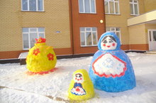 Фигуры из снега «Самовар и Матрешка», изготовленные воспитателями, младшими воспитателями совместно с родителями групп №13,№14.