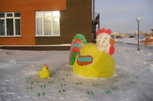 Фигура из снега «Петушок-золотой гребешок», изготовленная воспитателями, младшими воспитателями совместно с родителями группы №6.