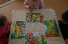На поверхности песка раскладываем 4-5 игрушек. Просим ребёнка закрыть глаза и закапываем одну игрушку. Открыв глаза, малыш должен определить и назвать, какой игрушки не хватает.