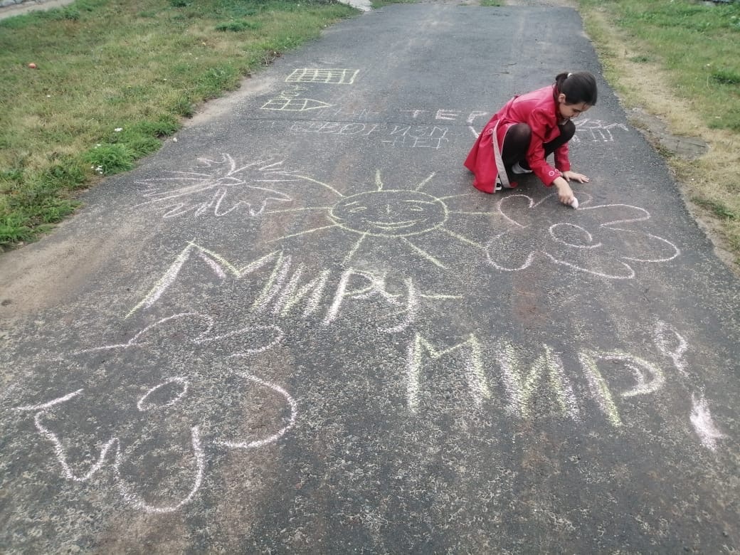 В конце занятия с детьми ко Дню солидарности в борьбе с терроризмом организовали конкурс рисунков на асфальте «Дружат дети всех народов. Я рисую мир».