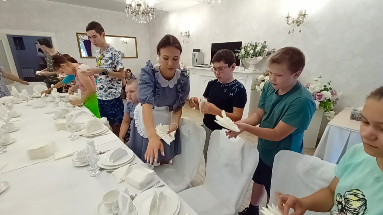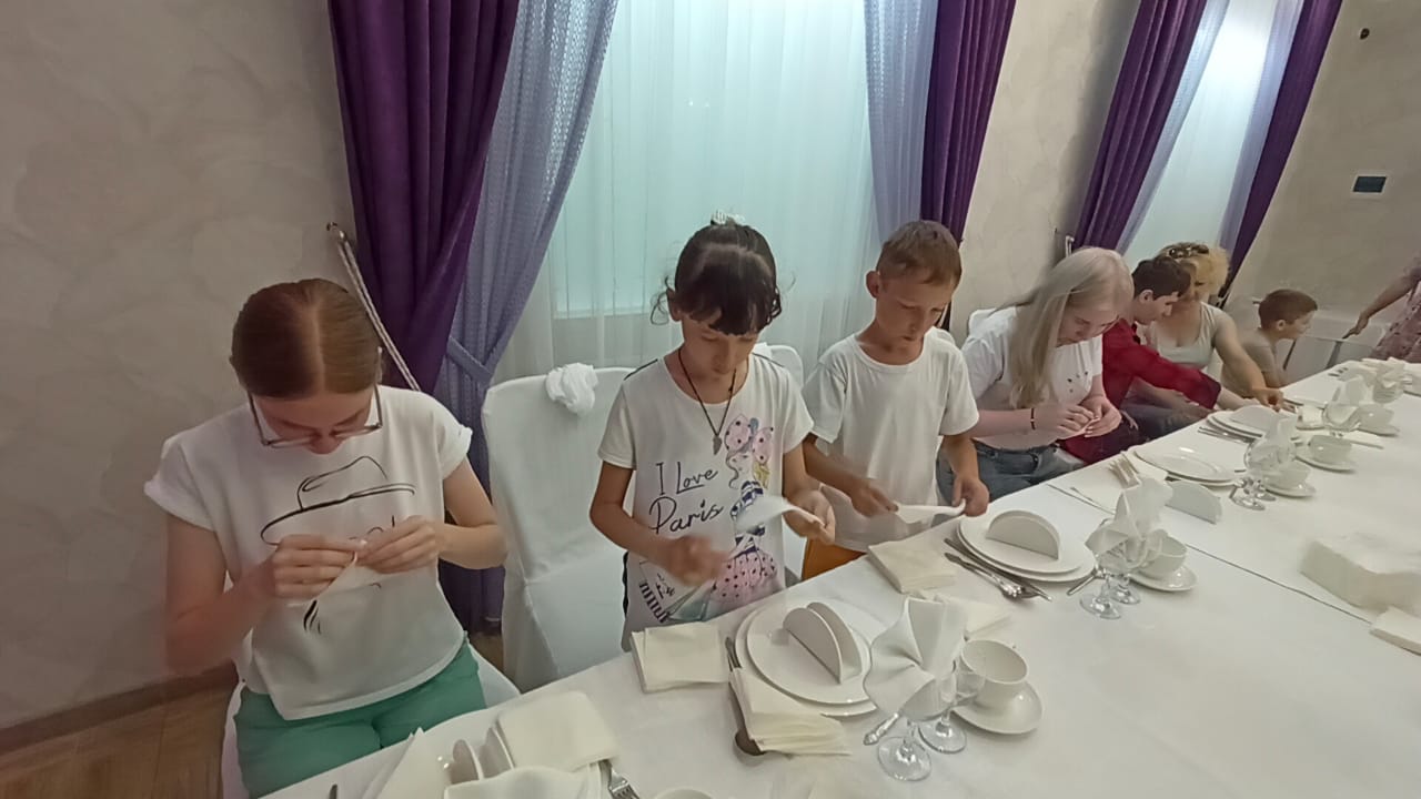 В практической части мероприятия каждому ребенку дали возможность попрактиковаться в складывании салфеток и сделать сервировку чайного стола.