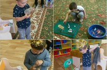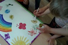 Использование нетрадиционных способов рисования, а именно пластиковой вилкой и руками. Дети от такого занятия просто в восторге. Сегодня они впервые воспользовались для этих целей гуашью.
