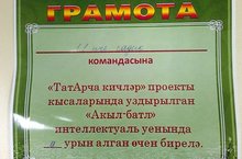21 декабрьдә Арча шәһәре "Казан Арты" музеенда "ТатАрча кичләре"проекты кысаларында "Акыл-баттл" интеллектуаль уены узды.Бу уенда безнең балалар бакчасыннан 4 кешелек команда катнашты. Балалар бакчасы җитәкчесе Зубаерова А.Ф.,өлкән тәрбияче Абдуллина Д.В.,татар теле тәрбиячесе Хөснетдинова А.М.,тәрбияче Ситдикова М.Ә. дүрт команда арасында ярышып 2 нче урынга ия булдылар. Телебезне саклау, тарихыбызны барлау,аны үзебездән соң килгән буынга түкми- чәчми тапшыру максатыннан оештырылган мондый проектларны оештыручыларга зур рәхмәт. Алда да кызыклы уеннар,проетлар көтеп калабыз.