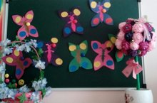 Сегодня мы с детьми на участке нашего детского сада наблюдали за разноцветными бабочками,которые порхали со цветка на цветок.Д етям они очень понравились.И мы из цветной бумаги сделали вот таких бабочек.