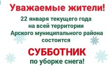 Уважаемые жители! 22 января текущего года на всей территории Арского муниципального района состоится субботник по уборке снега. Просим принять активное участие в расчистке общественных пространств (тротуаров, парковок, территорий, прилегающих к обектам всех форм собственности)