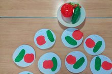 Тема:"Тәлинкәдәге кыяр һәм помидорлар".Максат:пөхтәлек,тырышлык тәрбияләү; квадрат һәм турыпочмаклыкның почмакларын түгәрәкләп кисәргә, сурәтне чиста, дөрес итеп ябыштырырга өйрәтү.