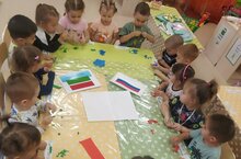 Сегодня в детском саду были проведены ряд развлекательных,поучительных,интересных дел.Воспитанники занимались отрывной аппликацией,слушали интересные рассказы воспитателей о флагах разных стран, на утренней гимнастике маршировали с флагами цвета нашей символики,воспитанники группы раннего возраста раскрашивали флаг в нужные цвета.