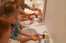 В младшей группе "Капелька " была проведена беседа "Чистые руки-залог здоровья". Цель беседы: формирование культурно-гигиенических навыков у детей младшего дошкольного возраста. Показать, как простое мьтье рук с мылом помогает эффективно бороться с заболеваниями . После беседы детки нарисовали чистые веселые руки.