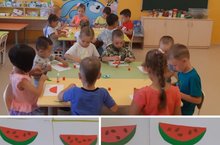 Сегодня дети средней группы на Международный день арбуза изготовили аппликацию "Арбузная долька"