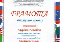 В конце мая прошел республиканский конкурс "Юный полиглот". Воспитанник старшей группы №3 Шайхиев Султан занял почётное 2 место. Поздравляем!