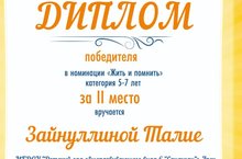 В рамках республиканского конкурса "Герои былых времён", Зайнуллина Талия принила участие и заняла второе место в своей возрастной категории за исполнение песни военных лет. Поздравляем руководителя Кашшапову А.М. и Талию с победой! Жедаем успехов!!!
