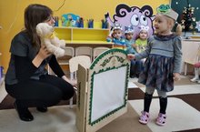 Дети с большим удовольствием общаются с куклами, мягкими зверюшками, чем со взрослым человеком. Сегодня мы с детьми второй младшей группы сходили в гости к Мишке. Мишка здоровается с каждым ребенком и задает короткий вопрос “Who are you?”. И в конце спели песню “Teddy Bear”.