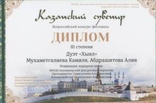 Воспитанники вокального ансамбля "Хыял" под руководством педагога дополнительного образования Самигуллиной А.В. участвовали во всероссийском конкурсе "Казанский сувенир" в г. Казани и заняли 3 место. Поздравляем их и руководителя с победой!